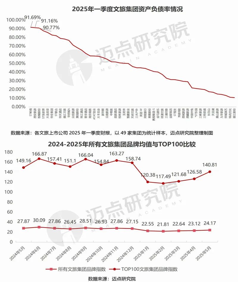 1.财务业绩:从49家文旅集团2025年一季度财务数据分析,营收情况出现明显分化。美团以865.6亿元的营收在行业中遥遥领先,但不足5亿元的占比67%且25家企业实现营收同比下滑,业绩不如预期。净利润方面,盈利企业有27家;亏损企业21家,以棕榈股份(维权)、东方园林(维权)等为代表的产业链企业与以华侨城A、云南旅游、曲江文旅(维权)等为代表的综合类企业亏损较严重。资产负债率维度,整体资产负债率均值为48%,风险处于可控范围,但ST岭南(维权)、西安旅游、棕榈股份资产负债率高达90%,财务状况较为严峻。