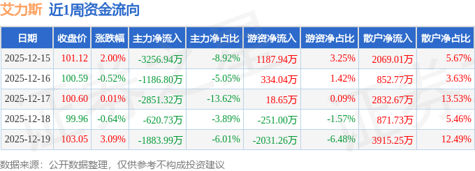 资金流向数据方面,本周艾力斯主力资金合计净流出9799.79万元,游资资金合计净流出741.63万元,散户资金合计净流入1.05亿元。本周资金流向一览见下表: